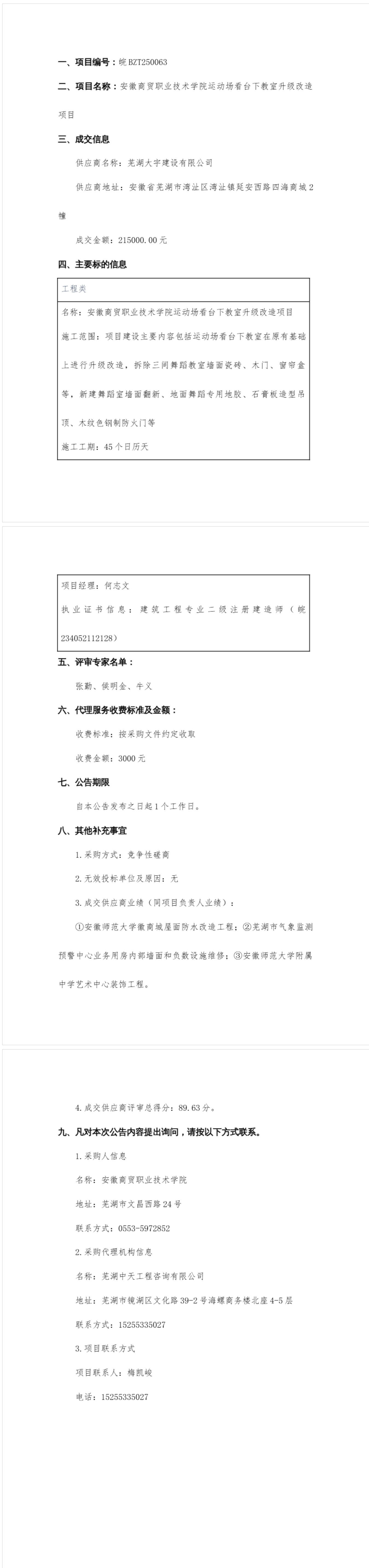 安徽商贸职业技术学院运动场看台下教室升级改造项目成交结果公告