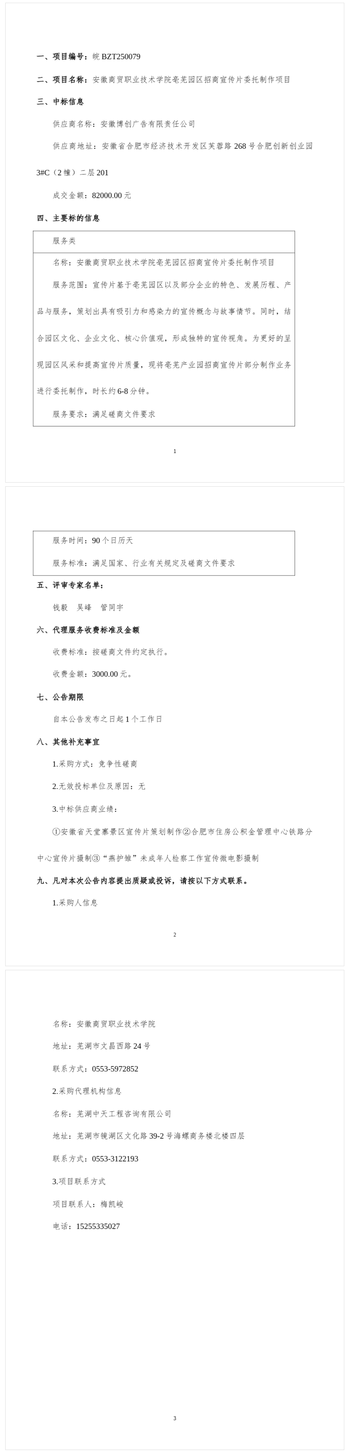 安徽商贸职业技术学院亳芜园区招商宣传片委托制作项目成交结果公告