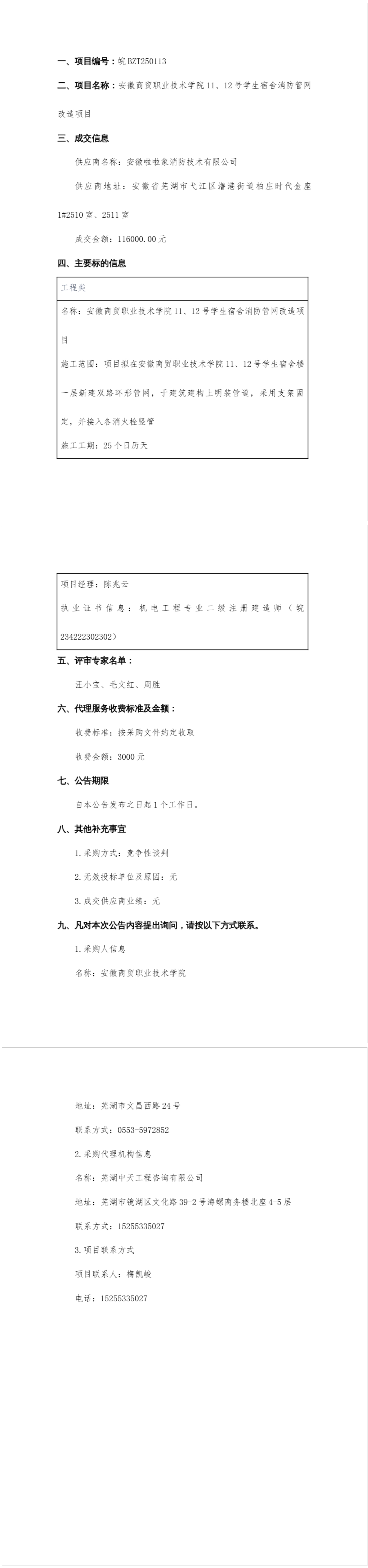 安徽商贸职业技术学院11、12号学生宿舍消防管网改造项目成交结果公告