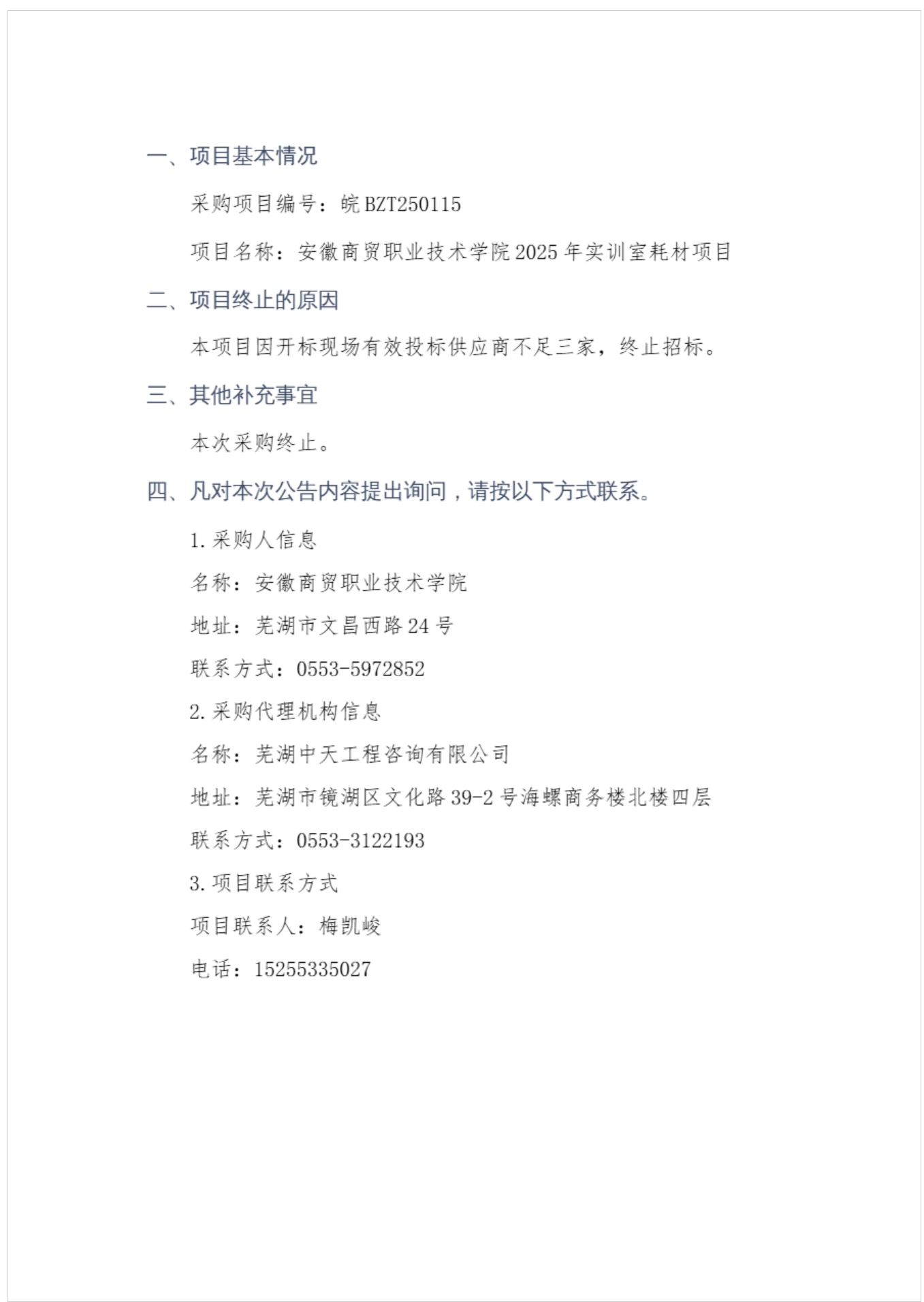 安徽商贸职业技术学院2025年实训室耗材项目终止公告