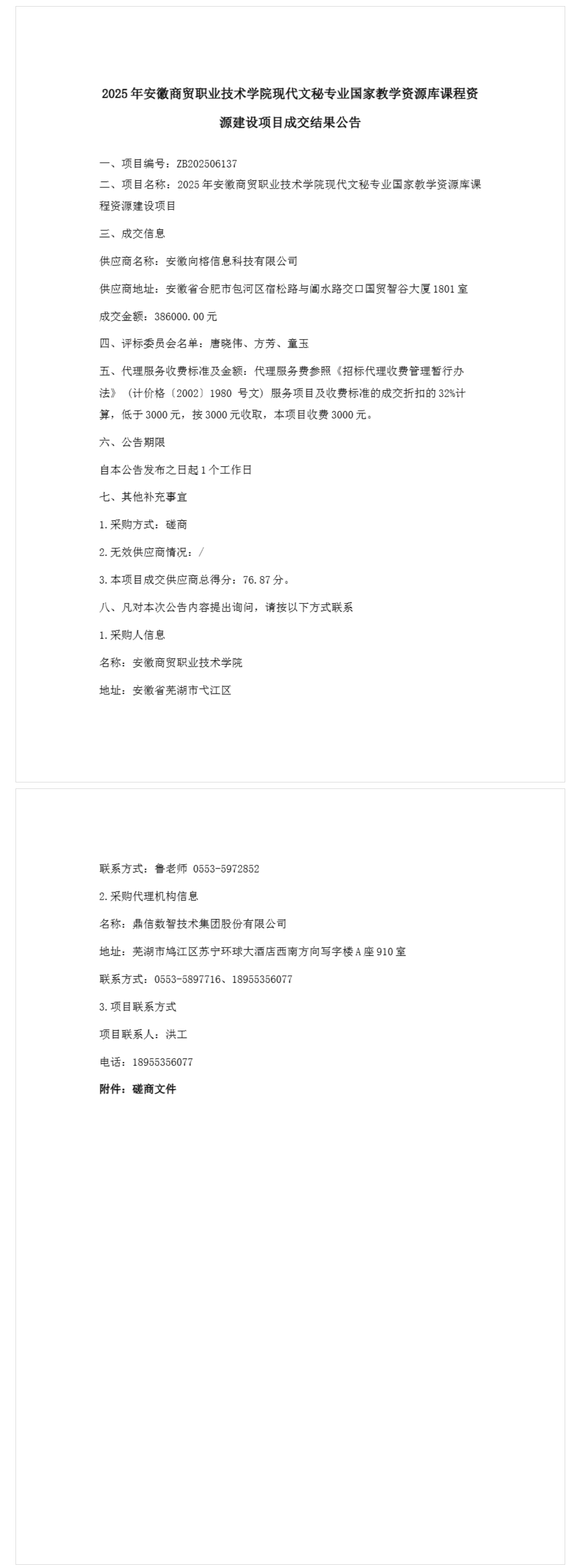 2025年安徽商贸职业技术学院现代文秘专业国家教学资源库课程资源建设项目成交结果公告