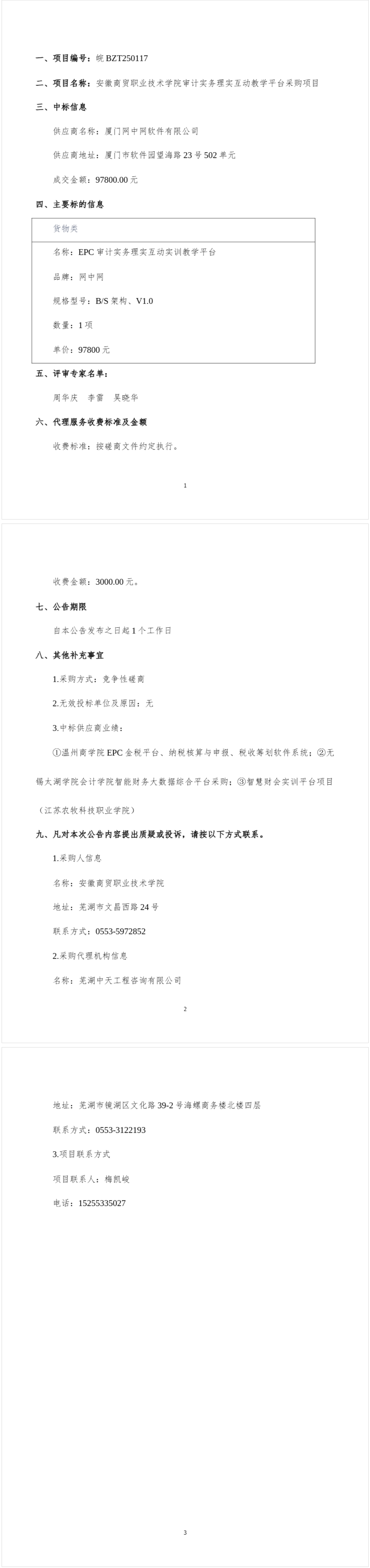 安徽商贸职业技术学院审计实务理实互动教学平台采购项目成交结果公告