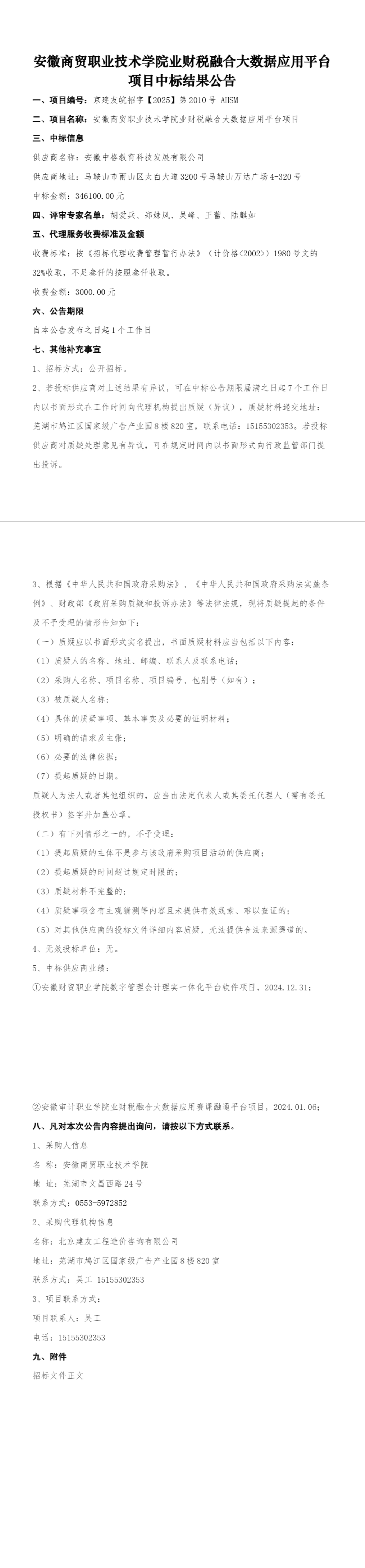 安徽商贸职业技术学院业财税融合大数据应用平台项目中标结果公告