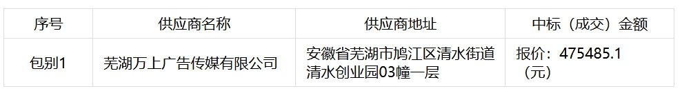 3.无效投标单位及原因:①芜湖创新广告装饰有限公司:投标单位单项投标单价超过本项目公布的单项最高投标限价;②安徽骏马品牌策划有限公司:开标一览表法定代表人或其代理人未按要求签字或盖章;③芜湖市跃龙广告有限公司:投标函中法定代表人未按要求签字或盖章,开标一览表法定代表人或其代理人未按要求签字或盖章。