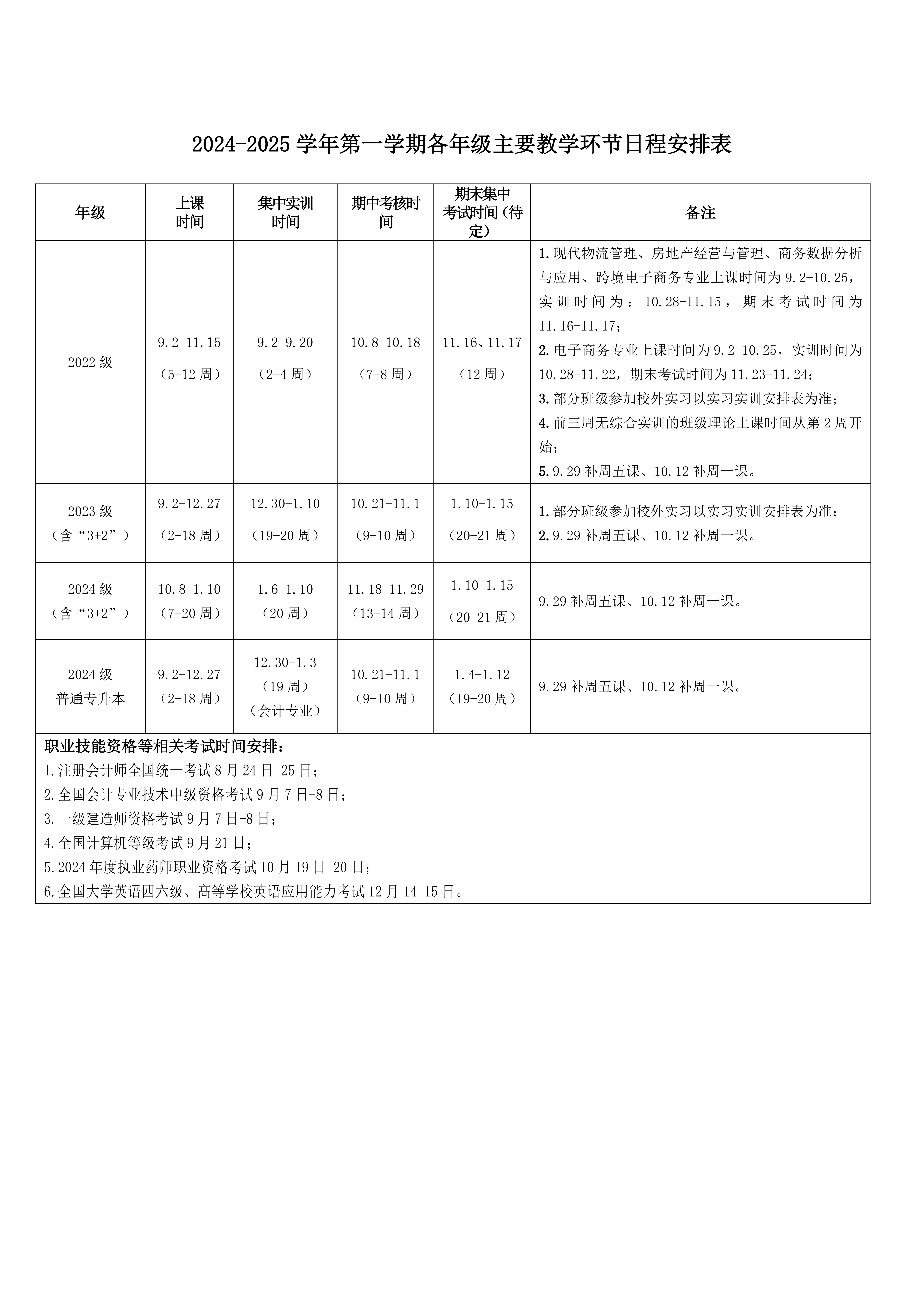 2024-2025学年第一学期各年级主要教学环节日程安排表