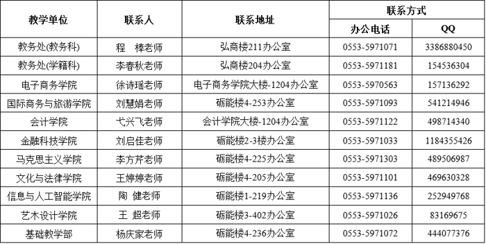 3.对补(缓)考课程成绩有疑义的请联系教务处学籍科李老师(弘商楼204办公室,电话:0553-5971181)。对考试安排有疑问的,请联系教务处教务科程老师(弘商楼211办公室,电话:0553-5971071)。其他特殊情况,请咨询各二级教学单位教学联系人。