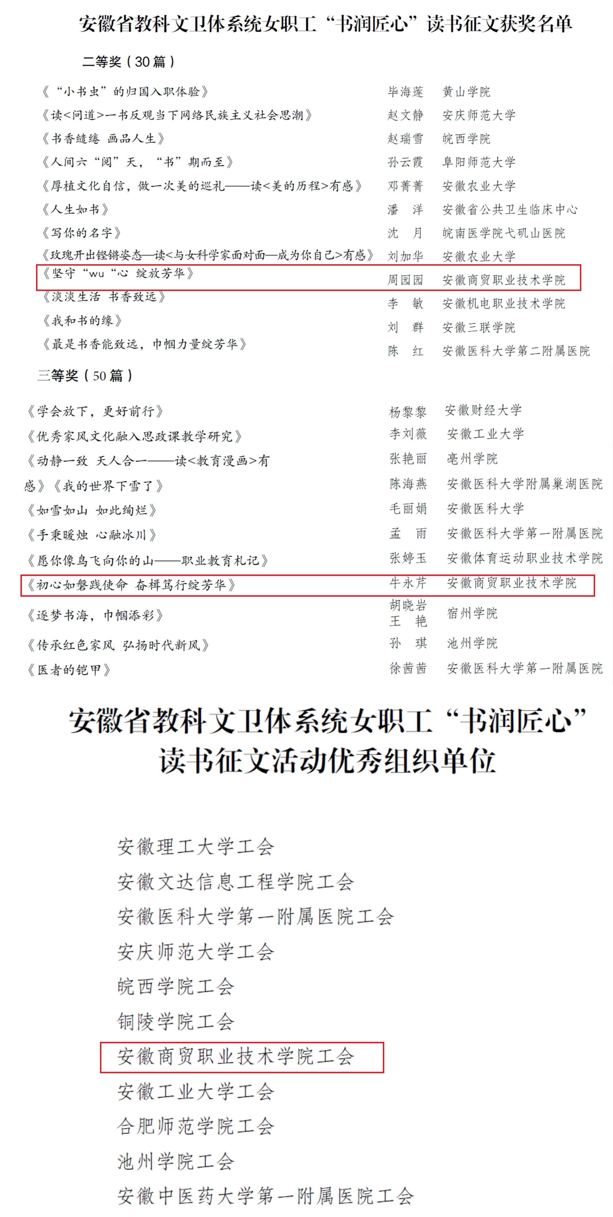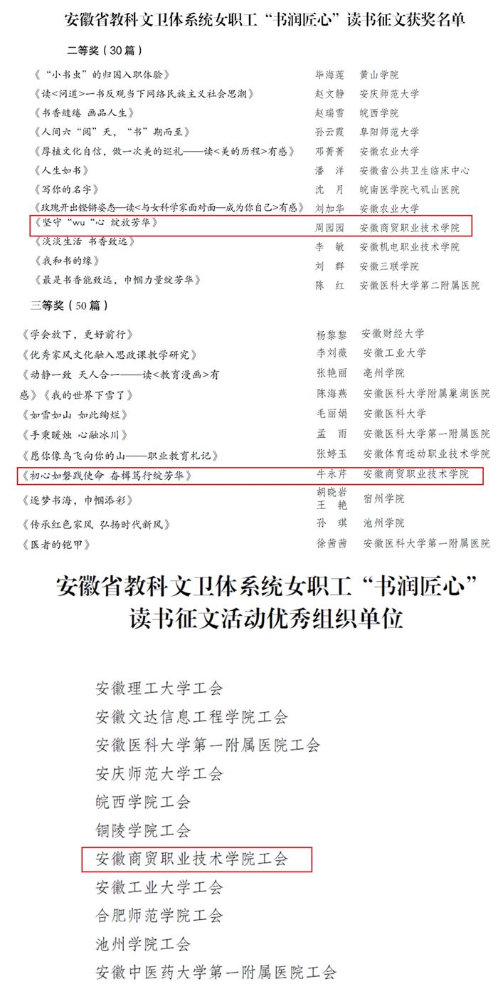 近日,省教科文卫体工会发布了《关于安徽省教科文卫体系统女职工“书润匠心”读书征文活动获奖情况的通报》,我校信智学院周园园、会计学院牛永芹老师分别获得二等奖、三等奖,学校获优秀组织单位奖。