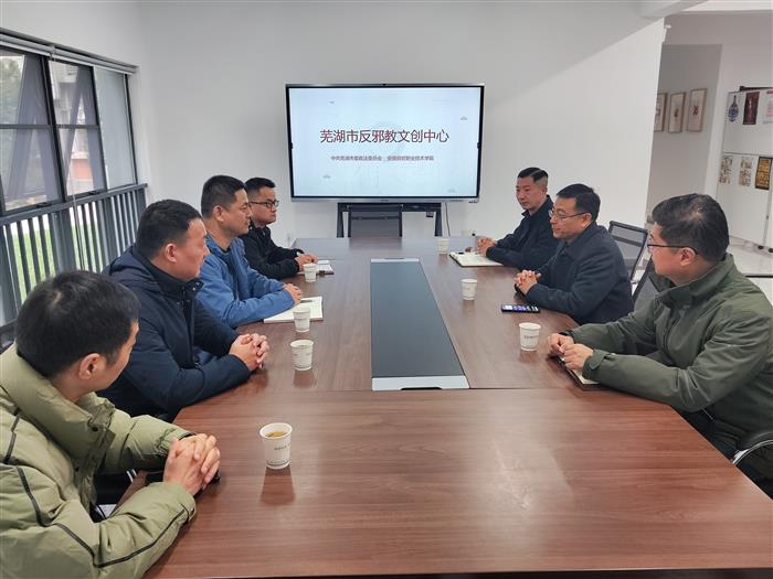 12月6日上午,省公安厅反邪处处长陈涛等一行在市公安局领导陪同下莅临校芜湖市反邪教文创中心调研,校党委副书记王炜,校艺术设计学院院长吴昊,副院长孙湛等参加了交流会。