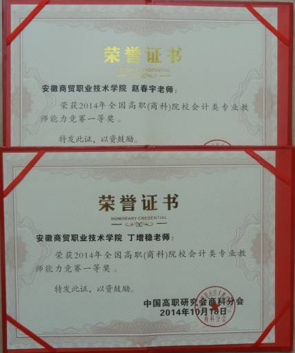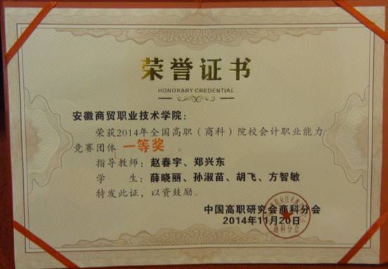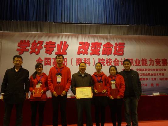 11月20日,由中国高职研究会商科分会主办、浙江商业职业技术学院承办的2014年全国商科院校“中教畅享杯”高职高专会计职业能力竞赛在浙江杭州举行。由会计系主任丁增稳为领队、赵春宇、郑兴东两位教师为指导老师、孙淑苗、胡飞、方智敏、薛晓丽4位同学组成的我院代表队最终荣获团体一等奖(第二名),4位学生均获得个人赛一等奖,赵春宇、郑兴东老师获“优秀指导教师奖”称号。此外,在全国高职商科院校教师会计职业能力比赛中,我院丁增稳、赵春宇两位教师组团参赛,获得了团体一等奖。