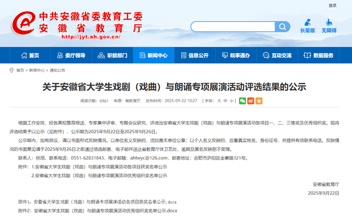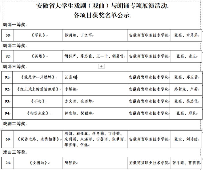 近日,由安徽省教育厅主办的全省大学生戏剧(戏曲)与朗诵专项展演活动评选结果揭晓。我校师生在展演中取得了优异成绩,共荣获朗诵类一等奖1项、二等奖1项、三等奖4项,戏剧类二等奖1项,戏曲类三等奖1项。