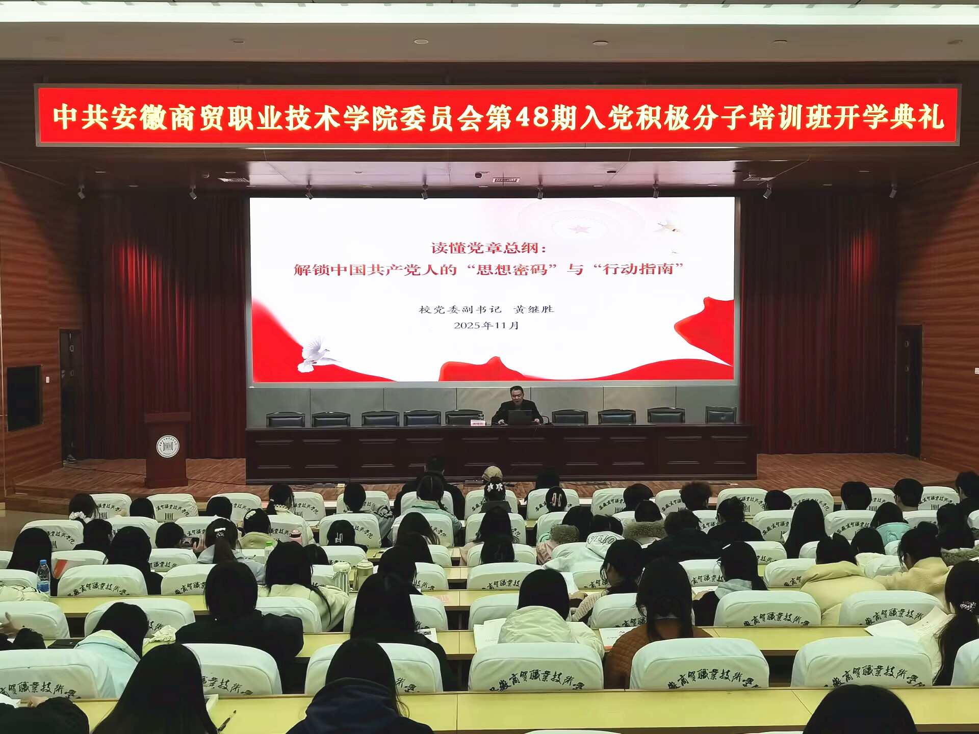 开学典礼后,黄继胜以《读懂党章总纲:解锁中国共产党人的“思想密码”与“行动指南”》为题讲授开学第一课。他以通俗生动的比喻切入,打破了大家对党章学习“严肃枯燥”的刻板印象,并从“总纲是什么、总纲的核心要义、如何争做新时代‘答卷人’”三个方面,系统解读了党的性质、宗旨和最高理想的核心内涵,让在场学员深刻体会到“没有共产党就没有新中国”的真理力量。