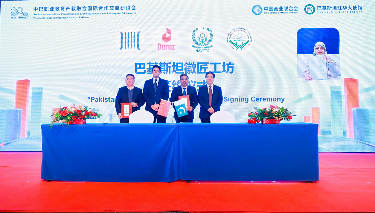 本次研讨会签署了一系列高规格合作协议,展现了中巴职教合作从“点上突破”到“面上开花”、从“资源输出”到“能力共建”的跨越式发展成果,标志着双方合作已进入体系化、实体化、长效化的全新阶段。会议当天,我校与巴基斯坦政府国家职业技术培训委员会、伊斯兰堡国家技能大学、巴基斯坦杰德电子服务有限公司四方签署共建巴基斯坦“徽匠工坊”项目合作框架协议,将为当地培养电子商务技术技能人才。