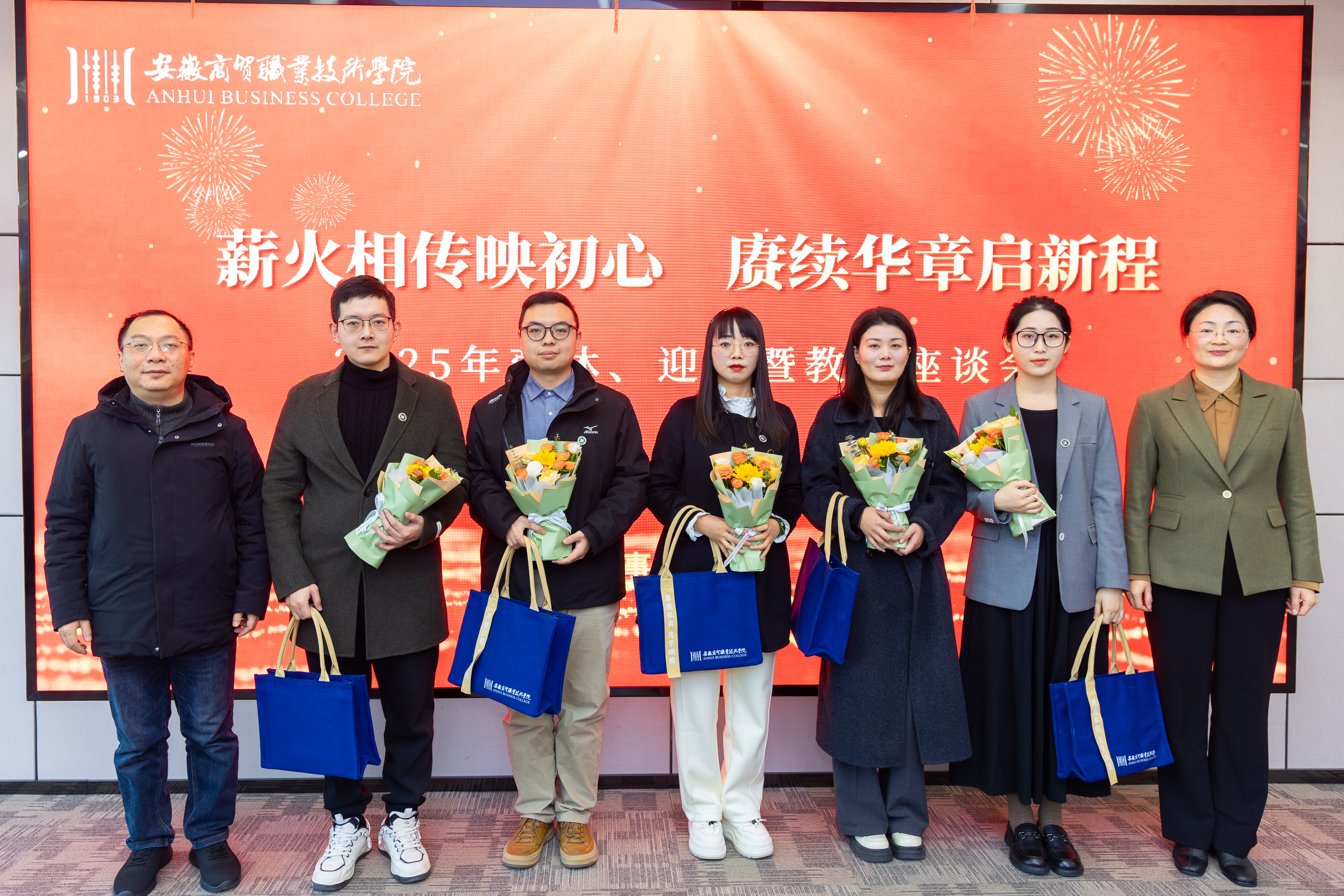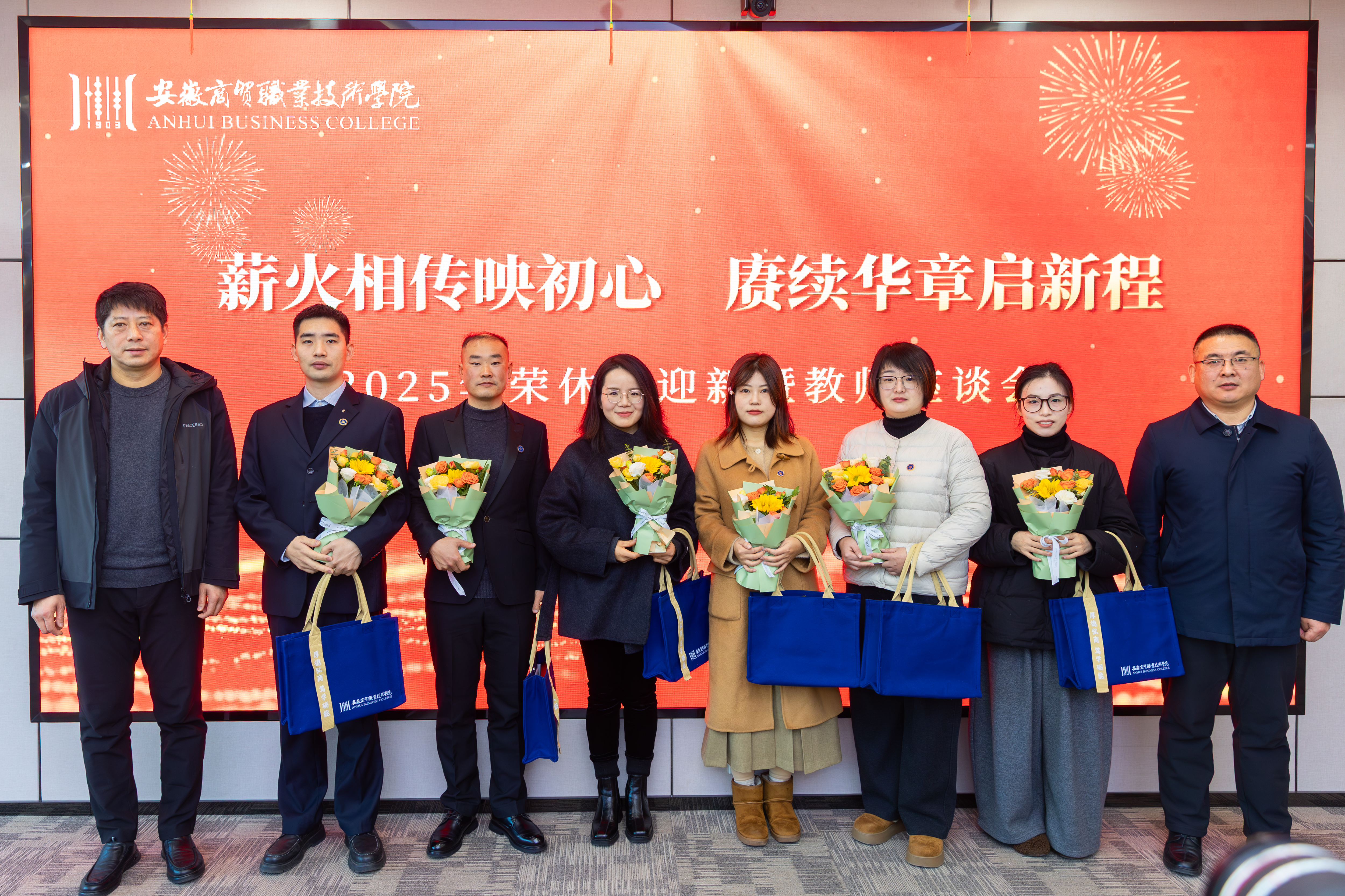 在欢快的乐曲声中,校领导分批向新教师赠送鲜花与入职纪念品,并为他们佩戴校徽。这枚小小的校徽,象征着他们正式成为“安商人”,加入了商贸大家庭。他们的到来,承载着学校未来的新希望。