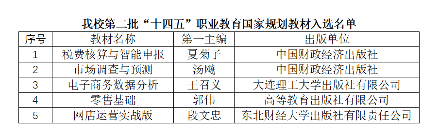 近期,教育部公布了第二批“十四五”职业教育国家规划教材书目遴选结果。我校组织申报的《网店运营》《电子商务数据分析》《市场调查与预测》《零售基础》《税费核算与智能申报》5本教材成功入选。