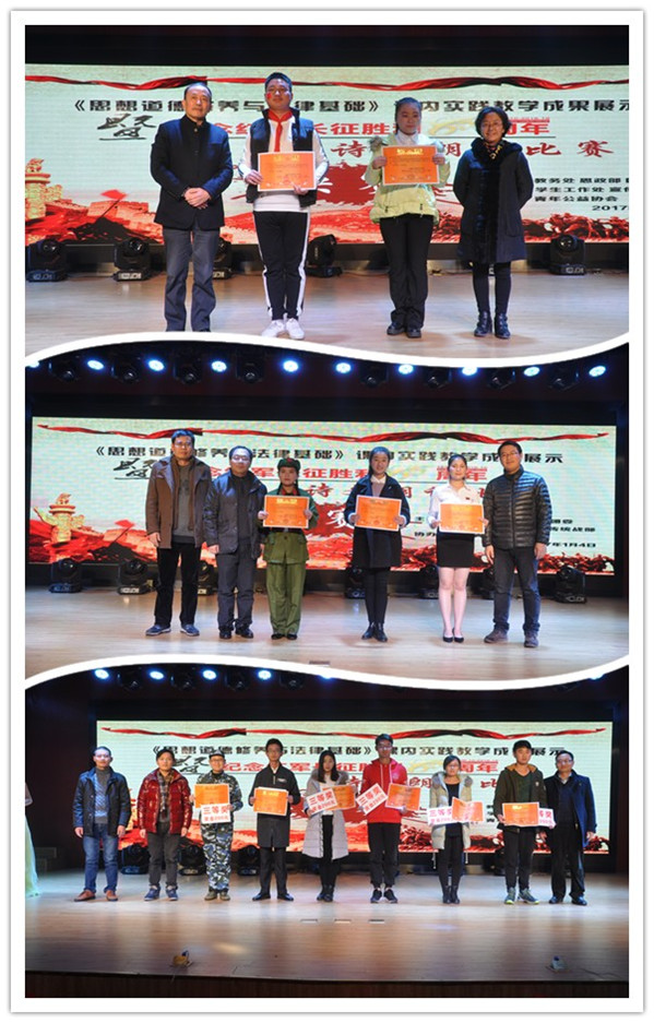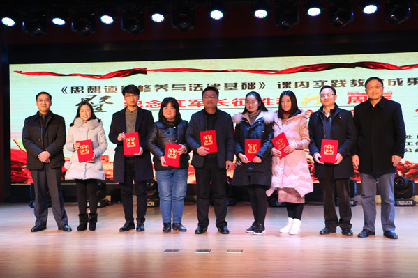 为进一步深化我院思政理论课实践教学改革,提升《思想道德修养与法律基础》课程教学实效性,缅怀革命先辈,传承长征精神,培育和践行社会主义核心价值观,讴歌中国共产党为实现中华民族伟大复兴中国梦的奋斗历程和光辉业绩,学院思政教学部携手教务处、学生工作处、团委和宣传统战部,经过历时三个多月的初赛、复赛和决赛,组织2016级全体大一新生成功开展了《思想道德修养与法律基础》课内实践教学成果展示暨“纪念红军长征胜利80周年”诗文朗诵比赛。