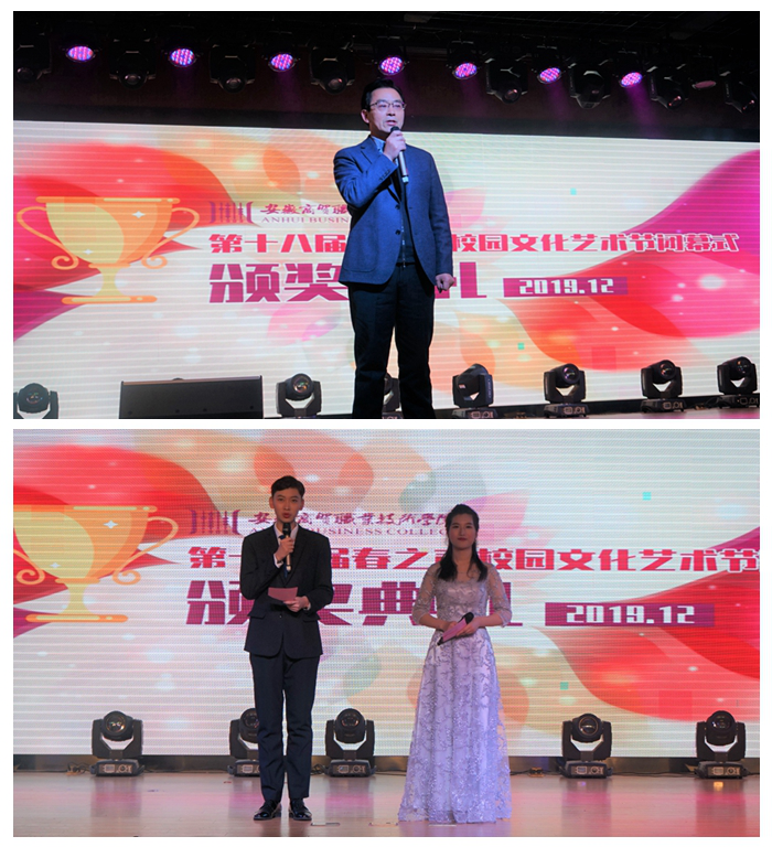 典礼上,校党委副书记、校长李忠作了热情洋溢的致辞。他肯定了“春之声”系列活动在展示学校师生文化艺术水平和我校“第二课堂”素质教育成果方面发挥的重要作用。并对校园文化建设提三点希望:进入新时代、新征程,新舞台应有新文化。一是“特起来”,文化艺术节项目的设计要结合专业特点,结合同学们今后工作岗位的特点,用特色的文化来助力双高学校的建设;二是“广起来”,扩大活动的参与覆盖面,让师生同台、让每个同学都有出彩的机会;三是“亮起来”,要让文化艺术节的成果闪亮,让文化成果走出校园、走向安徽、走向全国。