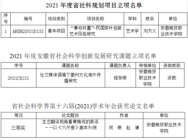 近日,省哲学社会科学规划项目和省社会科学创新发展研究项目立项、省社科界学术年会征文结果陆续公布,我校教师取得优异成绩。其中,艺术设计学院刘方义老师的《“兼收并蓄”—民国茶叶包装艺术风格研究》喜获安徽省哲学社会科学规划项目青年项目立项,国际商务与旅游学院程张根老师的《社交媒体语境下徽州文化海外传播研究》喜获安徽省社会科学创新发展研究课题攻关研究类课题立项,基础教学部何燕和赵谦老师撰写的论文《生态翻译视角看黄梅戏的英译——以<六尺巷>剧本为例》在安徽省社科界第十六届(2021)学术年会喜获三等奖,是安徽省高职院校唯一获奖作品。