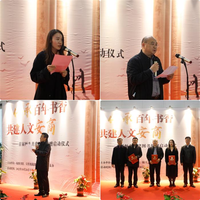 随后,图书馆馆长季学芳宣读“传承百年书香 共建人文安商”首届师生共建图书捐赠活动倡议书。