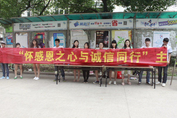 为进一步落实有关学生资助工作精神,加强对学生的诚信、感恩、励志和成才教育,强化学生的自尊、自强、和自立意识,6月9日,由学生工作处主办、学生工作助理总队协办的“怀感恩之心 与诚信同行”签名活动在学院学生食堂门口举行。