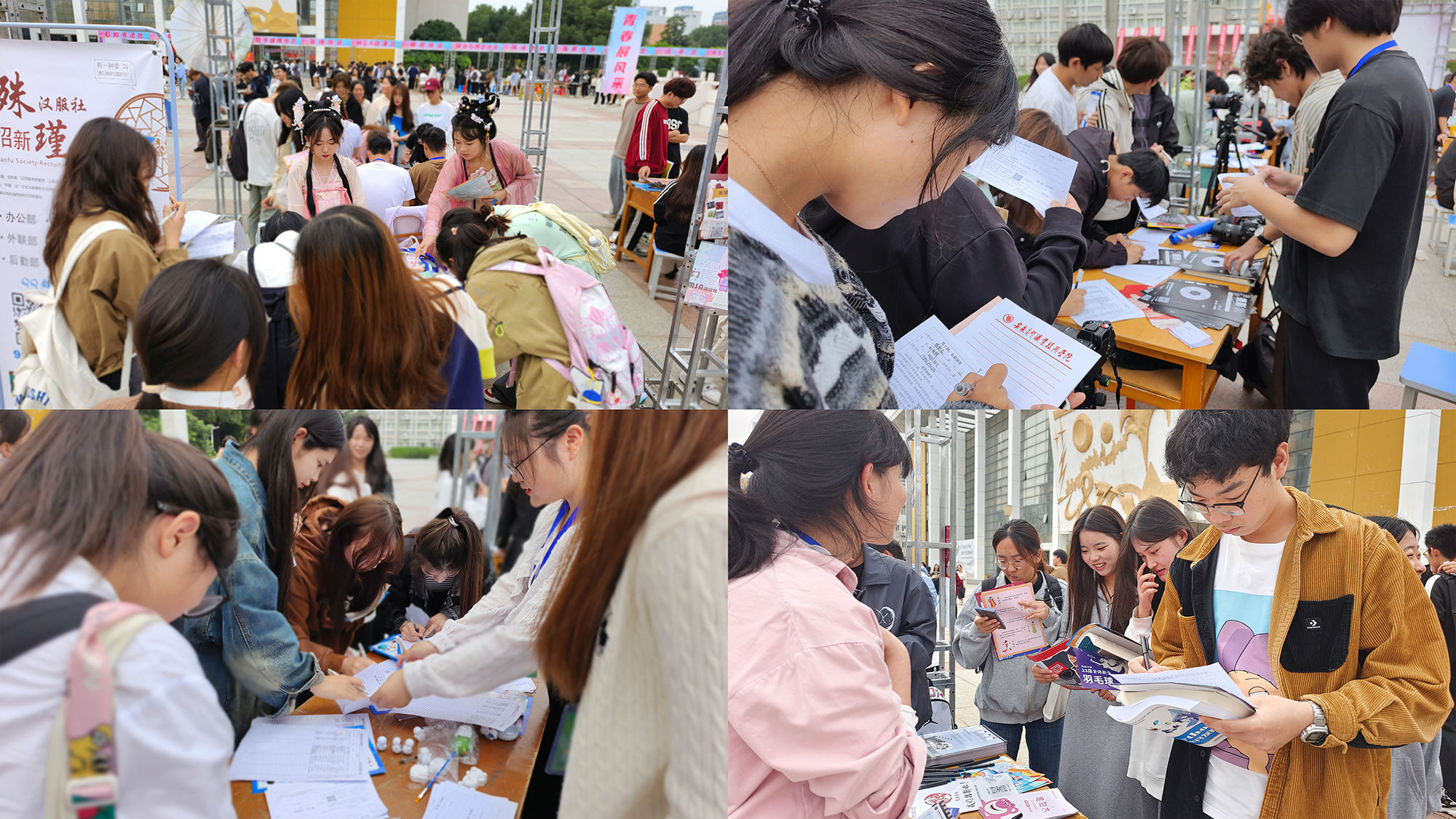 活动现场,社团“各显神通”,汉服社、动漫社的展位前衣袂飘飘,同学们身着盛装,用服饰为自己的社团代言;摄影协会的展台上“长枪短炮”、羽毛球协会的展位上球拍缀满、石如书法协会墨香飞舞,社团纷纷亮出特色,摇旗呐喊。在社团文化展示环节,社交礼仪协会、演讲社、汉服社、啦啦操协会、街舞协会等社团先后登场,精彩的节目赢得阵阵喝彩,也把招新现场的氛围推向高潮。