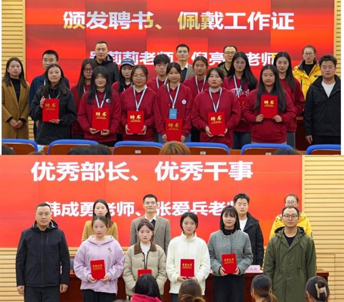 学院查靖老师为2021级球队队长颁发聘书和纪念品,吴莉莉、倪亮亮老师为2022级团学组织学生干部颁发聘书、并佩戴工作证,杨成兵、张爱兵老师为2021级团学组织主席团优秀成员、优秀部长和优秀干事颁发荣誉证书和纪念品。