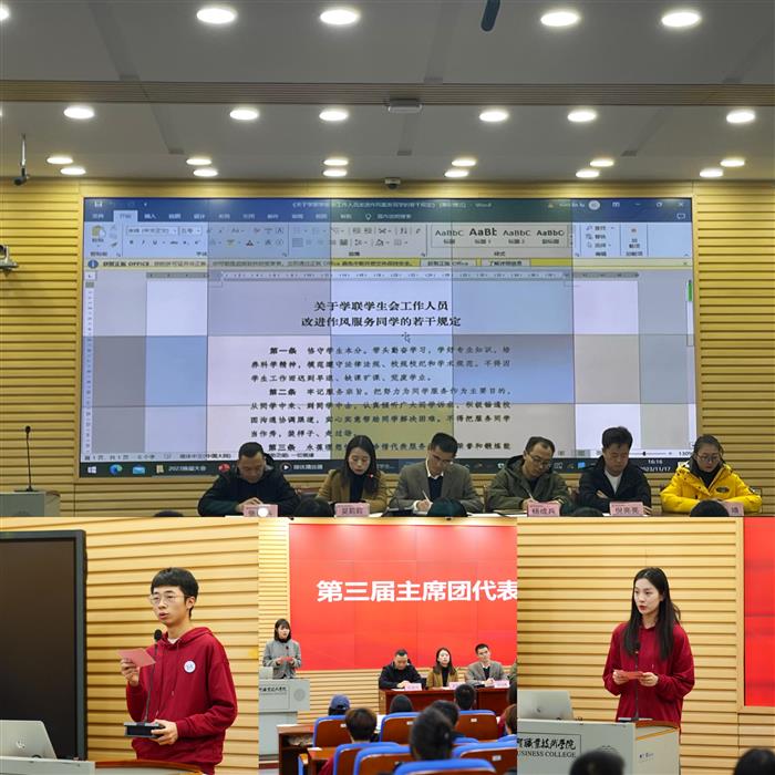 为深入贯彻习近平总书记关于青年工作的重要思想,进一步加强团组织建设,提高团组织的凝聚力和引领力,形成良好的工作格局,11月17日下午,国际商务与旅游学院在砺能楼四录播室举行学院第四届团学组织换届大会。学院党总支书记韩成勇、团总支负责人吴莉莉、组织员兼办公室主任杨成兵、学生第一党支部书记倪亮亮、学生第二党支部书记张爱兵以及学院辅导员代表查靖,2021级、2022级团学组织相关人员,学院学生球队和艺术团学生代表参加大会。大会由吴莉莉主持。