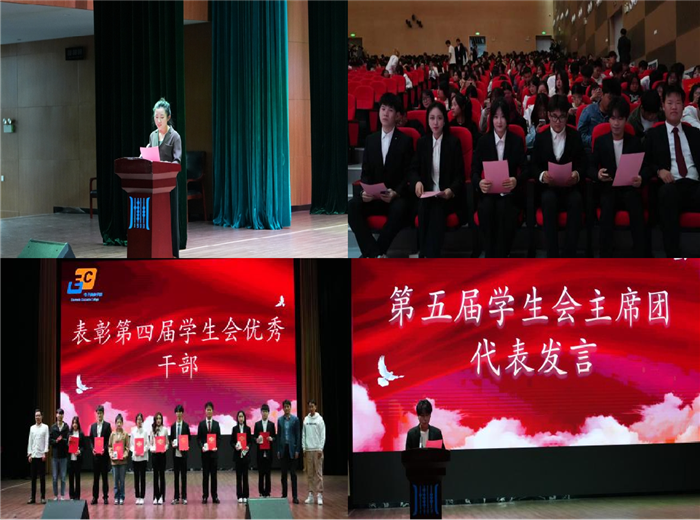 会上,学院对第四届学生会优秀干部给予表彰,紧接着,第五届主席团代表上台发言,正式接过了传承与发展的接力棒。会议最后,徐影宣读了第五届干事名单以及颁发部门工作奖品,并合影留念。