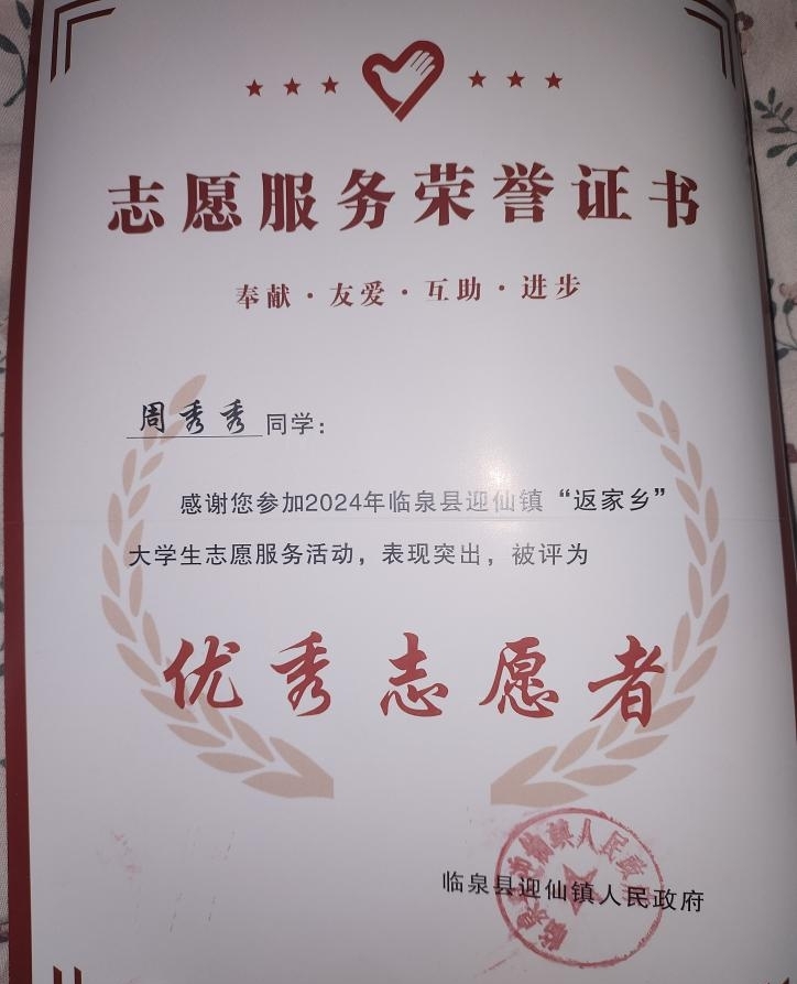 为展现家乡变化,学院广泛动员并开展了红色调研和返乡实践活动,全院近百余名学生响应号召。其中,周秀秀同学在家乡临泉县迎仙镇团县委组织的社会实践活动中表现突出,获评“临泉县迎仙镇优秀志愿者”称号。她说道:“在志愿服务过程中,我不仅学到了大学课堂上学不到的知识,还通过实践更加深入地了解了社会和乡镇发展的方方面面。同时,我学会了如何与团队合作解决问题,提升了适应环境的能力。这些实践经验将对我未来的学习和工作产生深远的影响。”