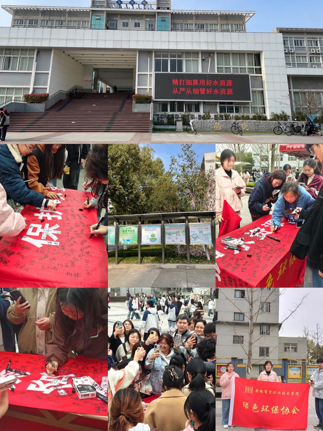 活动现场,同学们积极参与,社团成员耐心向参与活动的同学宣讲节水知识及生活小常识,如日常洗漱调小水龙头,不用长流水冲洗,发现滴水龙头及时关闭、损坏龙头及时报修等,倡导师生们在日常生活中养成节约用水的好习惯,号召同学们从身边小事做起,用好节水器具,高效利用滴滴清水,争做节水倡导者和践行者,为绿色低碳发展贡献一份力量。宣讲结束后,大家纷纷拿笔在横幅上郑重签上自己的姓名。