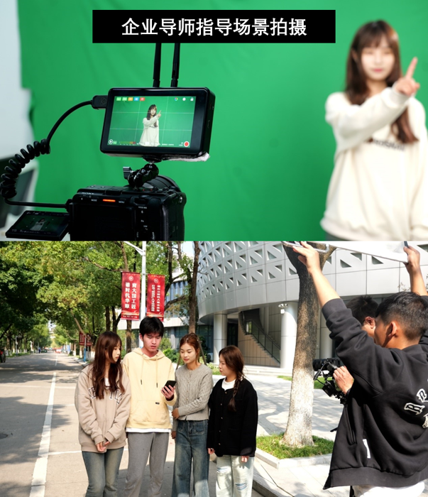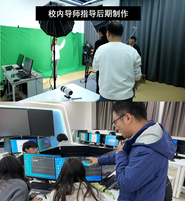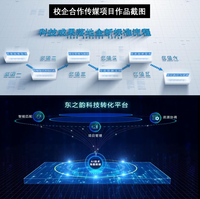 在STEAM项目化教学实施过程中,短视频数字化运营微专业的师生团队充分发挥原有专业优势,按数字媒体技术专业、电子商务专业、计算机网络技术、网络新闻与传播等专业划分成数据分析组、创意策划组、视频拍摄组、后期特效组;从市场调研、内容策划、广告文案、脚本撰写、视频后期制作到新媒体推广,模块化分工参与项目。前端数据分析组在校内导师张丽媛、徐诗瑶指导下完成科技成果转化平台市场需求调研和数据分析,内容策划组在微专业负责人薛瑞昌指导下精心策划了多个视频创意脚本,短视频拍摄组在企业导师胡京生导演、校内导师唐云龙指导下完成实景和虚拟场景的视频拍摄任务,后期特效组在企业导师朱飞总监、校内导师钱亮的指导下完成视频合成与特效制作。同学们在校企导师指导下,全流程学习商业视频的创作逻辑与运作模式、视频拍摄与制作的技术,为进一步投身数字传媒行业沉淀了宝贵的经验。