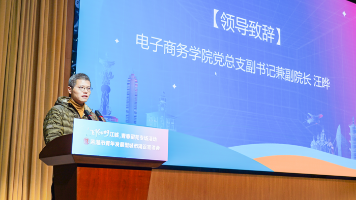 会上,电商学院党总支副书记兼副院长汪晔致辞,向与会领导、嘉宾、校友对学子就业创业工作的关心表示感谢,他期望同学们秉持一颗感恩的心,珍视在芜湖这片热土上的学习与成长经历,积极为芜湖的发展贡献自己的智慧和力量。