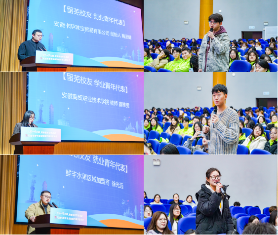 活动现场,2013届校友现电子商务学院教师虞雅雯,2015届校友现鲜丰水果股份有限公司区域经理徐光远、2016届校友现安徽卡萨珠宝贸易有限公司总经理陶丞健,分别就学业(学历提升)、就业和创业等主题进行分享交流。