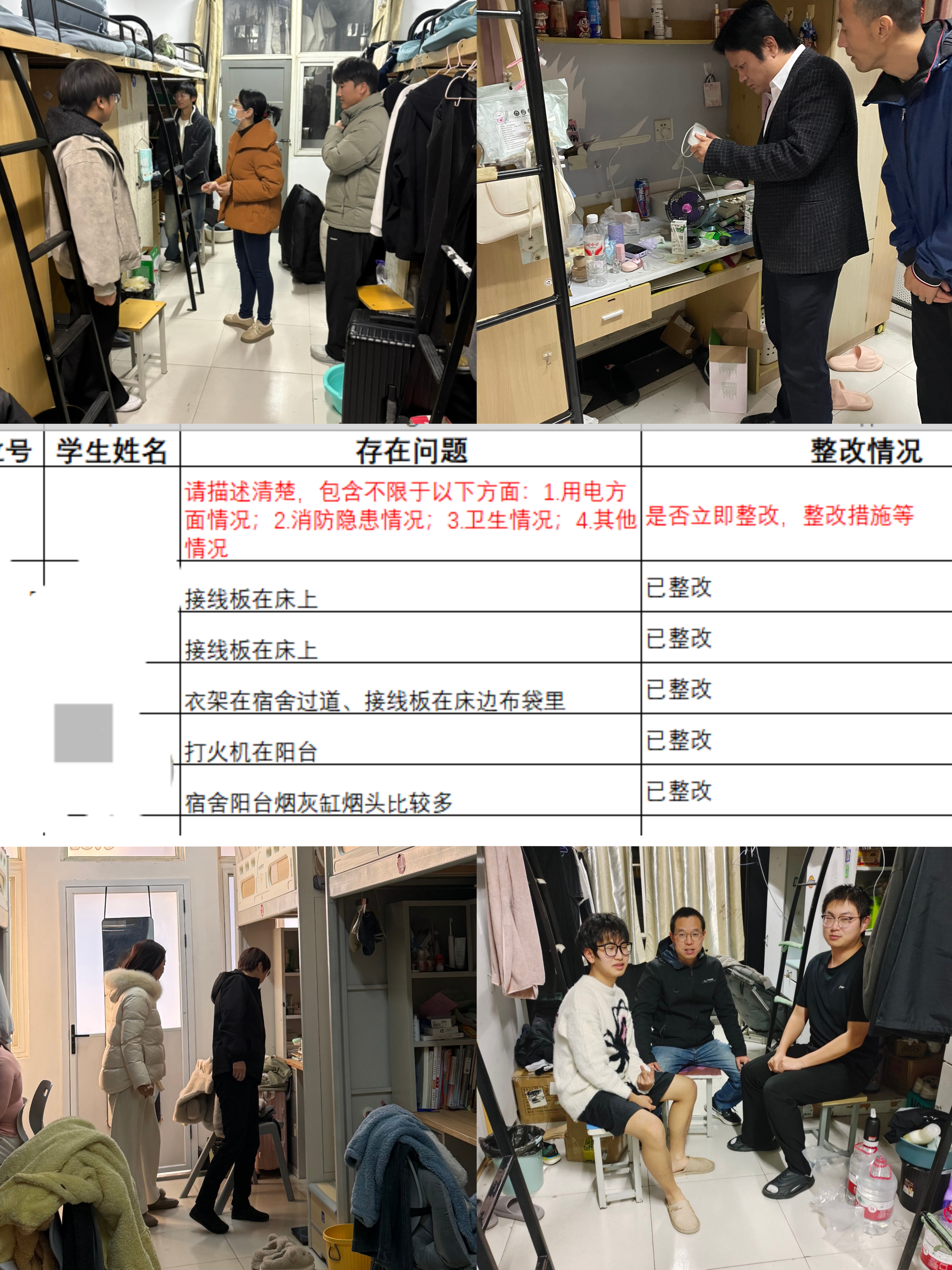 针对在检查中发现的安全隐患与卫生问题,学院建立宿舍问题台账清单,实行“发现-登记-整改-复查”闭环管理机制。台账详细记录了每间宿舍的问题类型、责任人和整改情况,辅导员定期跟进整改进度,确保问题“件件有着落”,力争将安全隐患消除在萌芽状态。