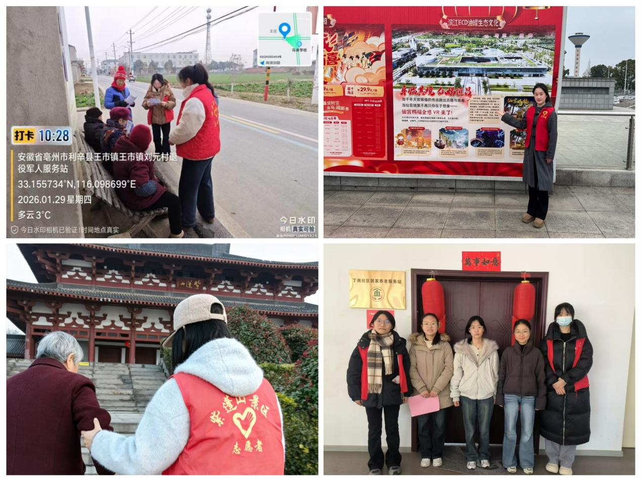 2026年寒假期间,金科青年学子积极响应学校与学院号召,怀着对家乡的热爱与对社会的担当,奔赴安徽省内各地基层一线,广泛开展公益志愿、文化宣传、政务实践、企业实习等形式多样的社会实践活动。他们以青春脚步扎根乡土,在服务群众中锤炼本领、收获成长,用实际行动诠释新时代青年的责任,为家乡发展注入青春活力。