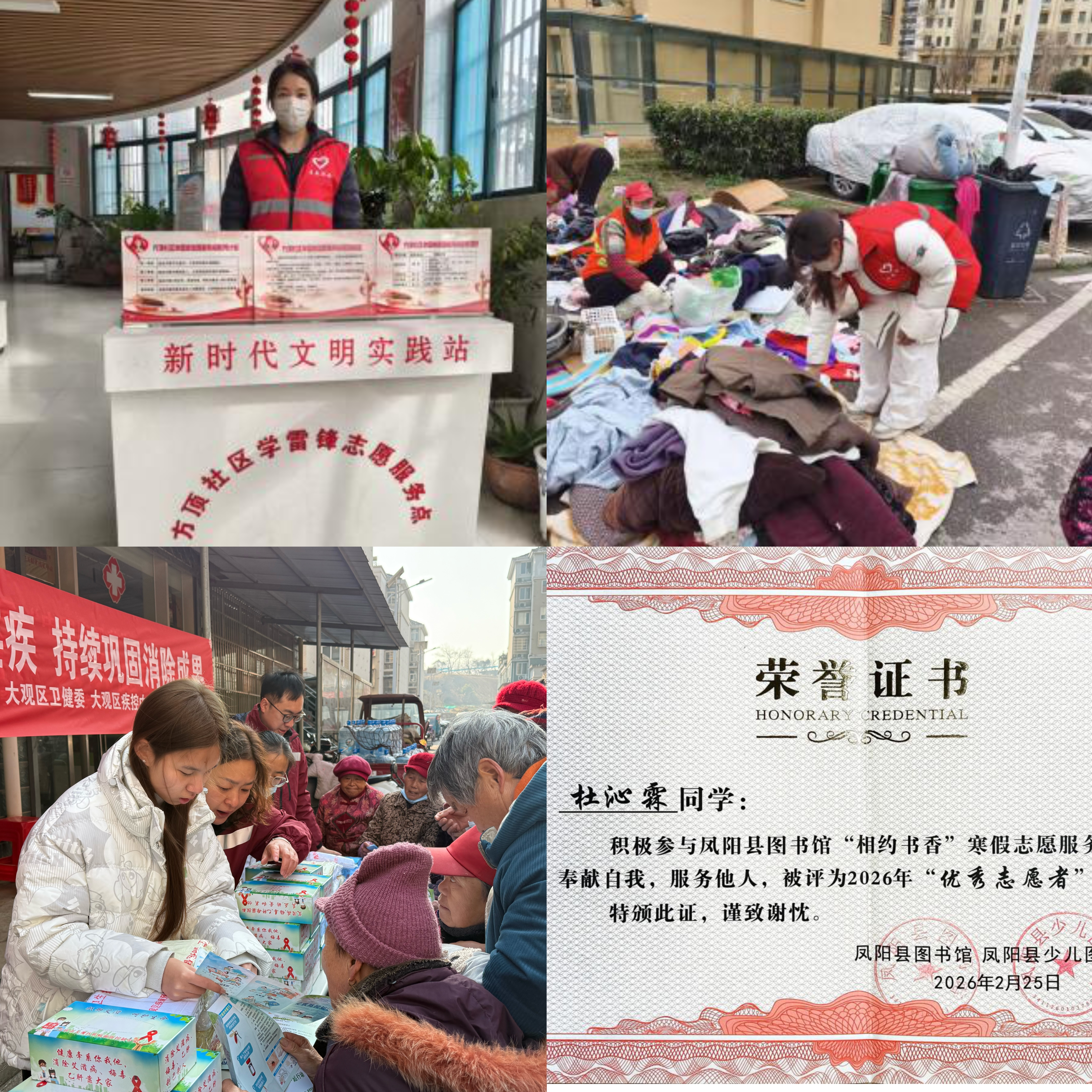 会计学院学生余芮参加社区举办的无人机CAAC执照培训宣传服务,前往社区广场、校园周边开展科普宣传活动;杜沁霖身着明制汉服向市民展示家乡凤阳明代文化底蕴,并参加凤阳县图书馆“相约书香”大学生实践活动;谢梦婷参与家乡寿县举办的遇“建”同行主题家乡实践活动,在春节期间积极参加志愿服务,为在三步两桥游玩的游客们提供便利;张欣欣协助完成家乡社区的日常办公文件处理、居民来访等接待工作,担任社区与居民的沟通桥梁;姚雨涵在安庆市大观区疾控中心参与春节输入性疟疾防控宣传实践。