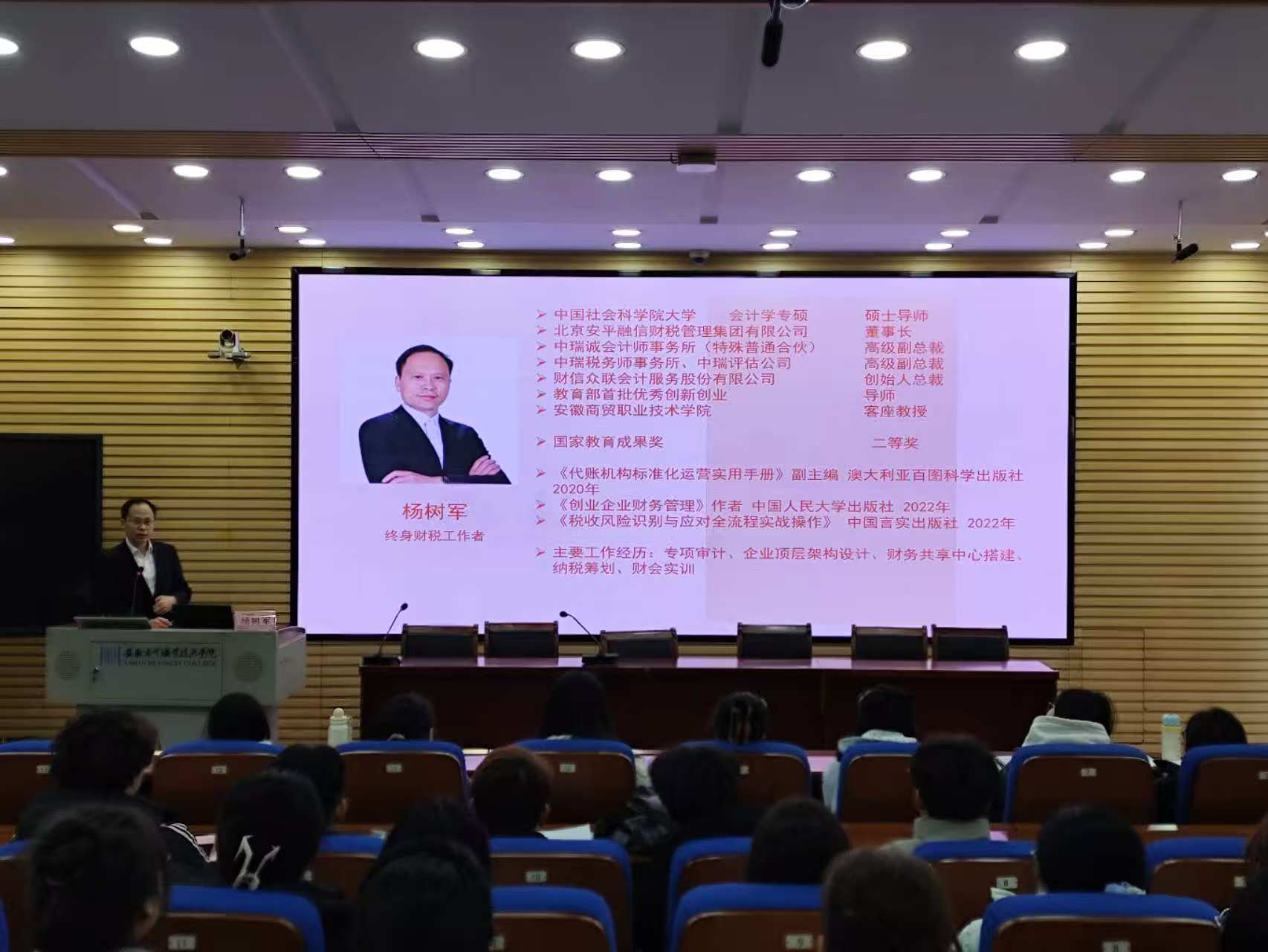 典礼最后,杨树军以“AI时代财税变革与实训实习”为主题开展专题讲座,结合行业实际案例,深入解析了人工智能在财税领域的应用场景与发展趋势,为同学们清晰指明了实训实习的重点方向以及未来职业发展路径,让在场学员受益匪浅。