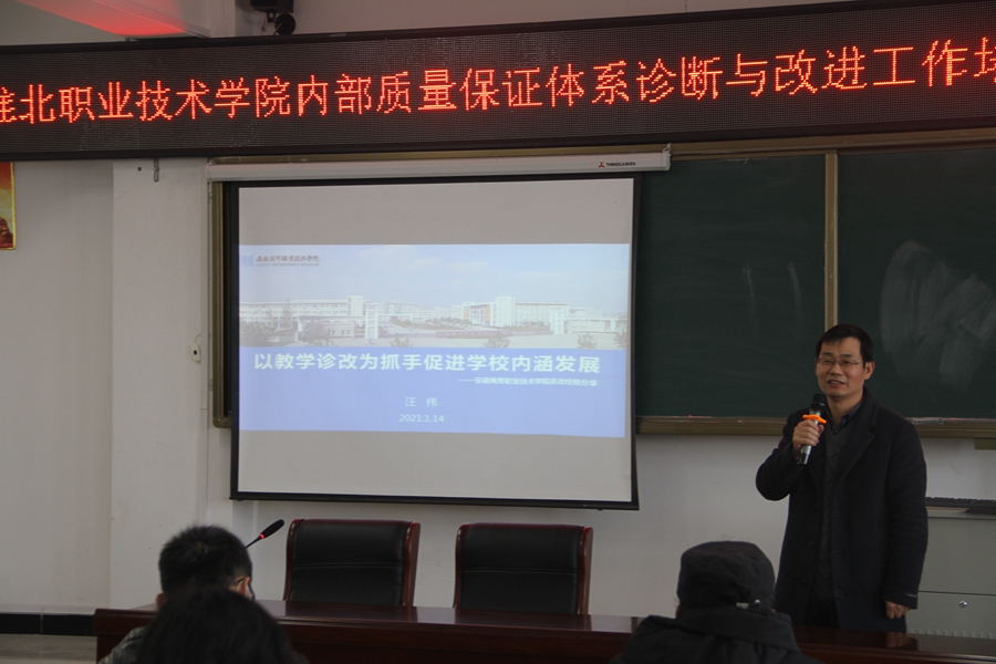 1月14日,校诊改办副主任汪伟应邀赴淮北职业技术学院开展内部质量保证体系诊断与改进工作专题培训。淮北职业技术学院副院长张亚、教务处处长赵淑云出席活动,各系(部)主任、教学秘书、教研室主任参加培训。