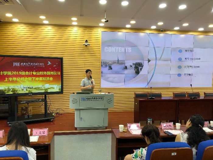 6月25日下午,会计学院举行2019级会计专业校外跟岗实习上半年总结会暨下半年双选会。会计学院副书记兼副院长鲁学生、副院长赵春宇、财会行业19位企业负责人、实习指导教师以及跟岗实习的全体同学参加了本次会议。大会由赵春宇主持。