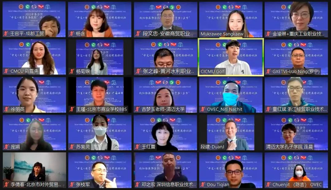 3月18日,2022中泰合作“中文+电子商务技能”项目精英培训班顺利闭幕。泰国教育部职业教育委员会职业技能及职业标准办公室主任尼迪·那齐、清迈大学孔子学院中方院长连晨、北京博导前程信息技术股份有限公司董事长段建出席了闭幕式,我校电子商务学院副院长段文忠作为特约代表参加了线上闭幕式。