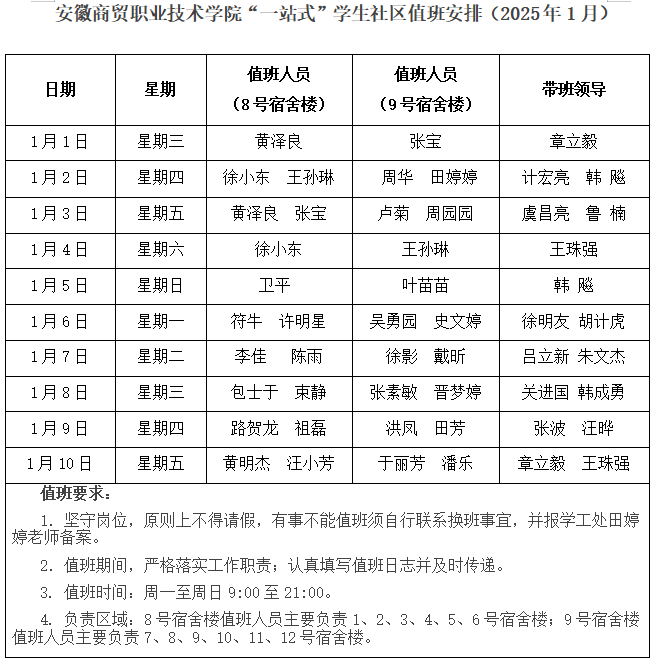 2025年1月“一站式”学生社区值班安排
